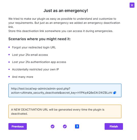 After heading to the next steps, the “Just an emergency” pop-up will appear. It will provide you with an emergency URL that deactivates the plugin if you encounter any issues.